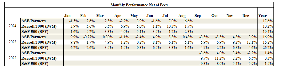 ASB Partners returned +6.6% in August and is +17.6% YTD net of fees through 8/31/2024;