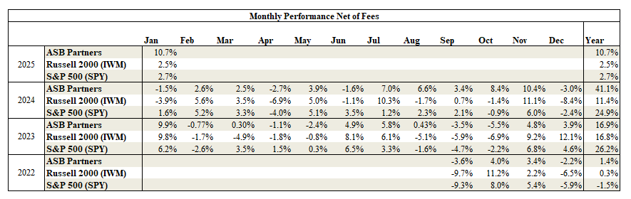 ASB Partners estimated net return was +10.7% in January and +10.7% YTD net of fees through 1/31/2025;