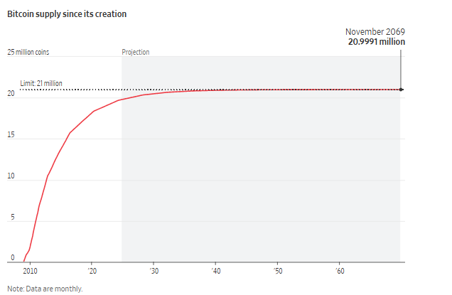The computer code behind bitcoin imposes a hard cap of 21 million bitcoins. So far, about 19.8 million bitcoins have been created, and it will take more than a century to create the rest, a process that will become increasingly difficult over time.