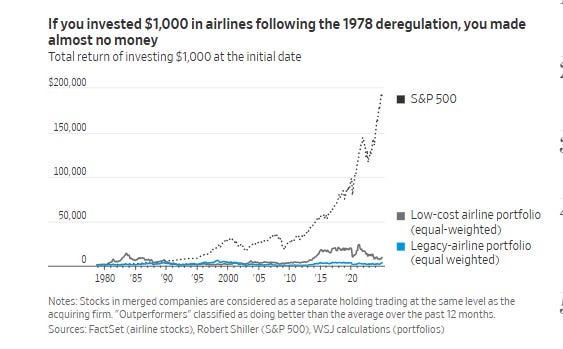 Indeed, the gains of the air-travel revolution have accrued to companies that make aircraft, not those that fly them: According to data by economist Kenneth French, aerospace ranks third out of 49 industries in total equal-weighted return during this period, whereas transportation is 28th.