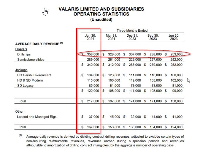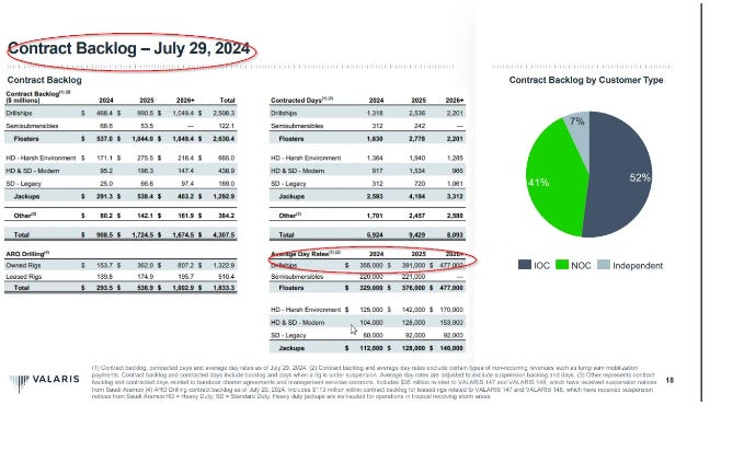 Valaris has seen a decent pick up in pricing, but what is most interesting is to compare the current pricing as of June 30, 2024 to their backlog: