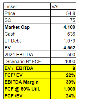 This is how much FCF VAL could generate under various scenarios, with the red circles showing where we are today: