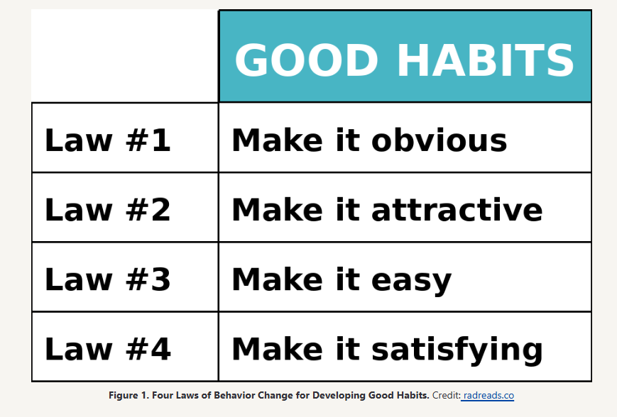 The key to Jamesâs advice is to follow four âlawsâ to incorporate an action into your routine so that it becomes a habit: 1) Make it obvious; 2) Make it attractive; 3) Make it easy; and 4) Make it satisfying.