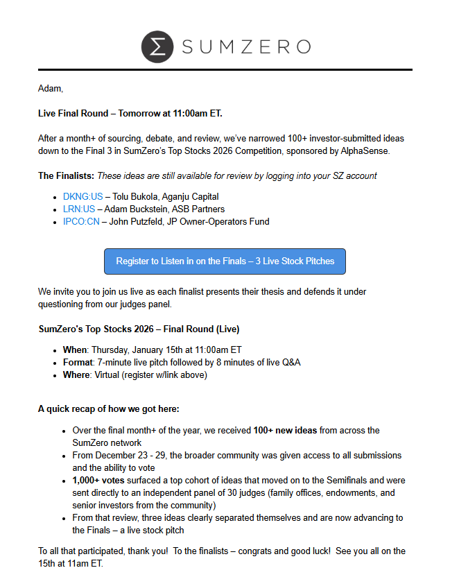 I was chosen as one of the Final 3 Contestants in SumZero's Top Stocks 2026 Competition... The Final Round will be held over Zoom this Thursday, January 15th, at 11am ET, and it's open to the public...Registration link is below: