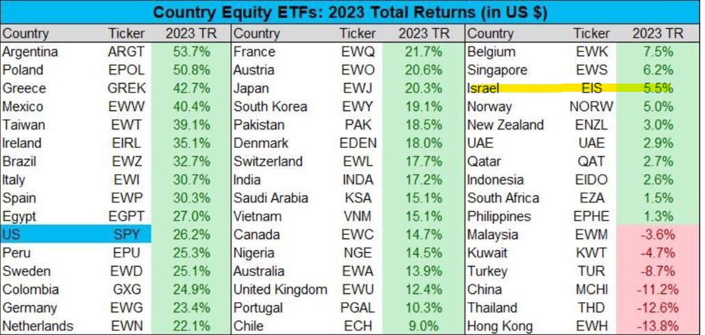 Israeli stocks had a tough 2023. The 1-2-3 punch of higher interest rates, controversial judicial reform legislation, and finally the war in Gaza weighed on the broader indices relative to other markets globally: