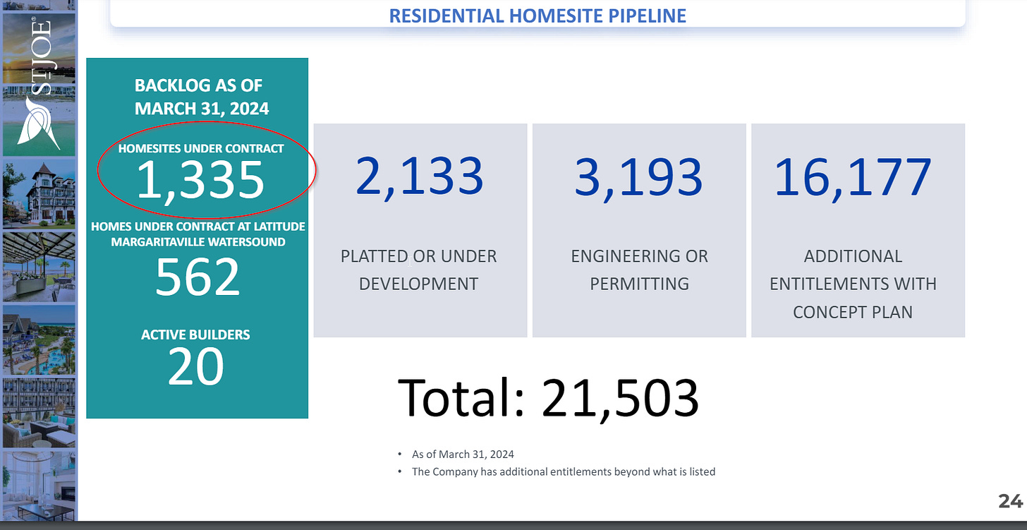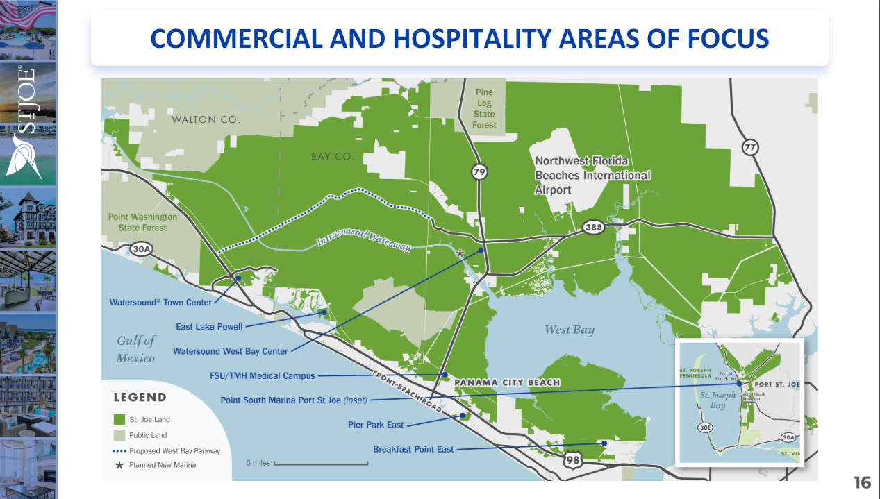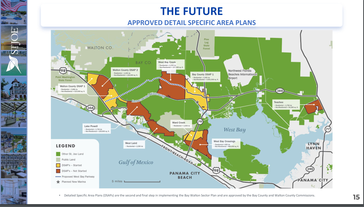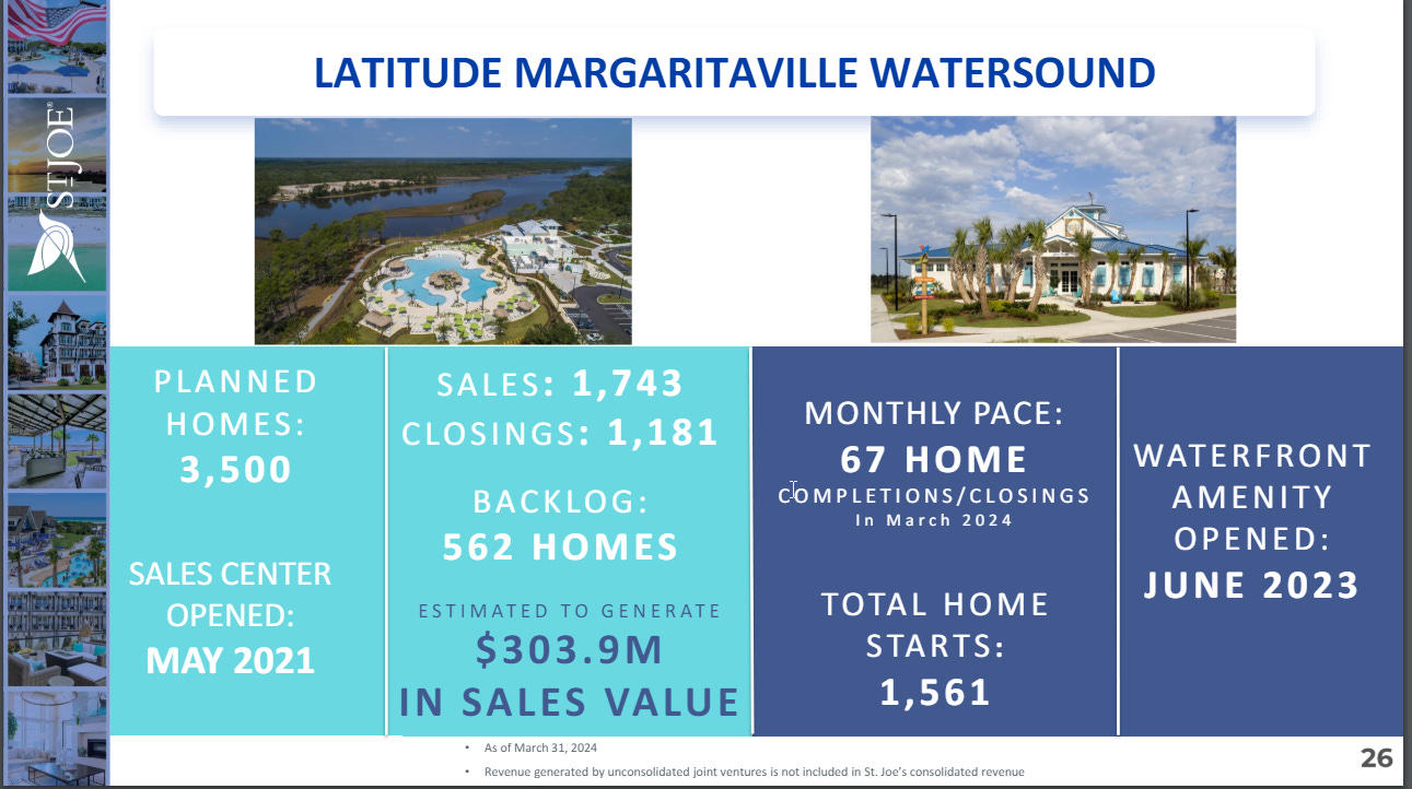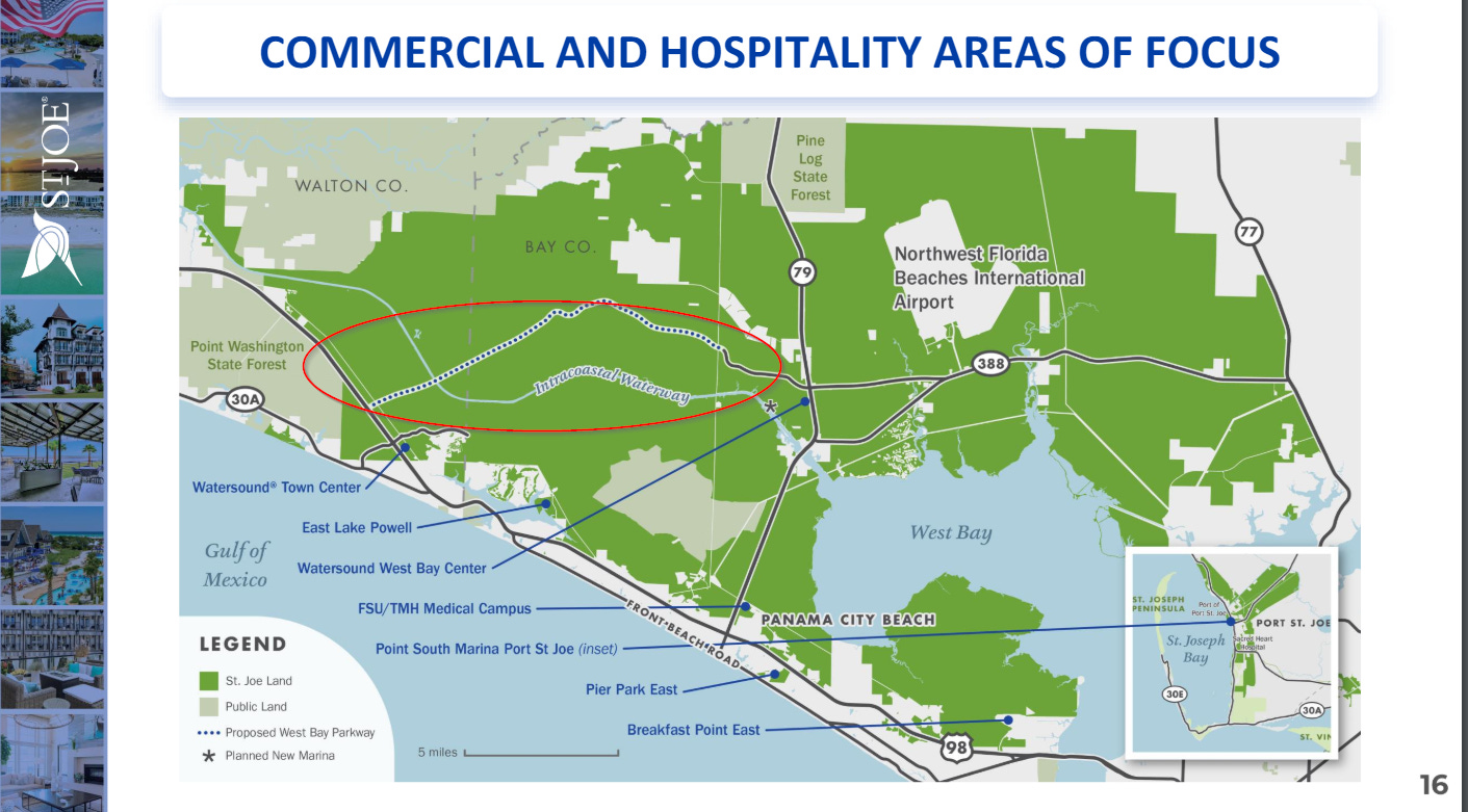 Equally exciting, Latitude Margaritaville, St. Joe 55+ community, which it is building in a JV with Minto, has already sold 1700/ 3500 homes in Phase 1 and is approved for another 5,000 units in its second phase (which surrounds the West Bay Parkway referenced above):